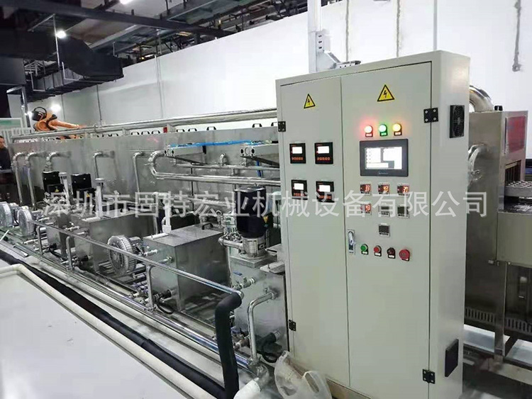 新能源鋰電池鋁殼超聲波清洗機作業(yè)流程:裝有產(chǎn)品的洗籃放置自動入料臺上,由PLC 控制進料系統(tǒng)定位再通過提升機構、平移機構的配合龍門機械手依次送入各工序段,對工件進行各工序段的清洗、漂洗、脫水、干燥完成后,通過傳動,自動將洗籃送出,人工卸下洗籃,即完成整個清洗過程。整機清洗部分為全封閉結構,裝有可拆卸的觀察檢修門。設備配電設施為獨立的電控柜放置進料口位置。經(jīng)多年的設計制造經(jīng)驗證明,結構合理,并配有超純水設備作為清洗水源是理想高潔凈度清洗專用設備。